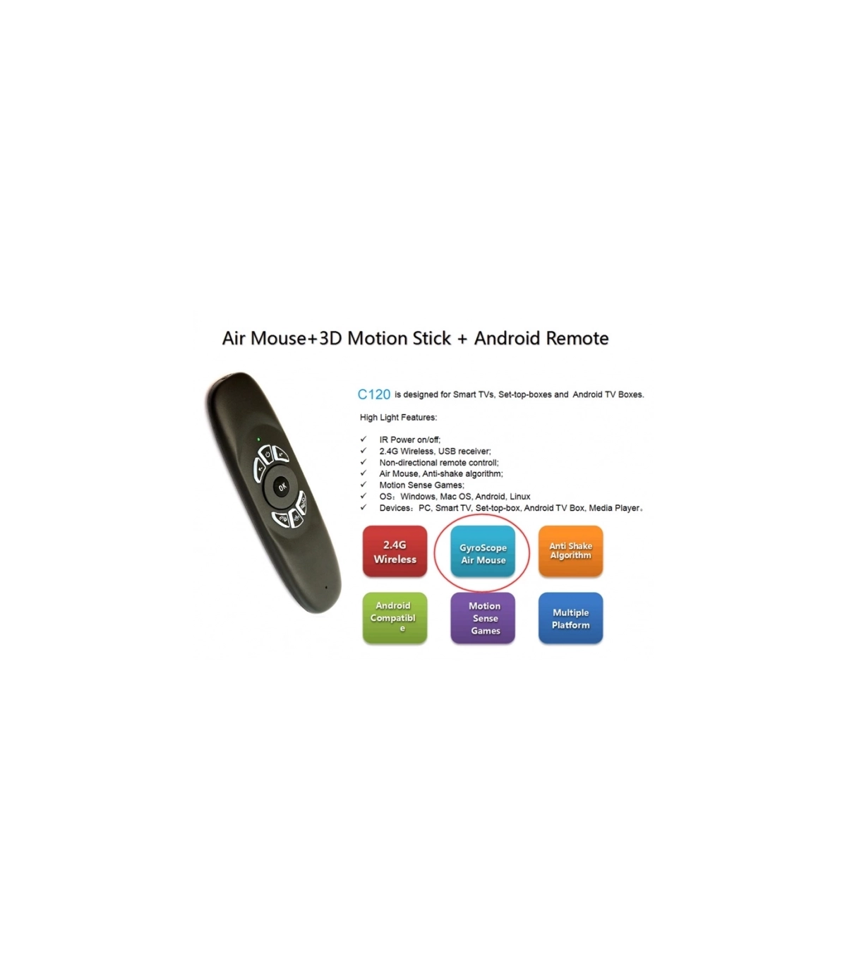 Китайская аэромышь Air Mouse C120L разработана специально для управления телевизорами через смарт ТВ приставки TV Box. Благодаря специальным технологиям Smart TV Air Mouse C120L позволит вам переключать страницы, подчеркивать, выделять, рисовать на экране, указывать на экране. Для исполнения этих функций аэромышь C120L оснащена трехосным гироскопом и 3-G sensor. Для большей наглядности модель аэромыши C120L оснащена светоуказателем.